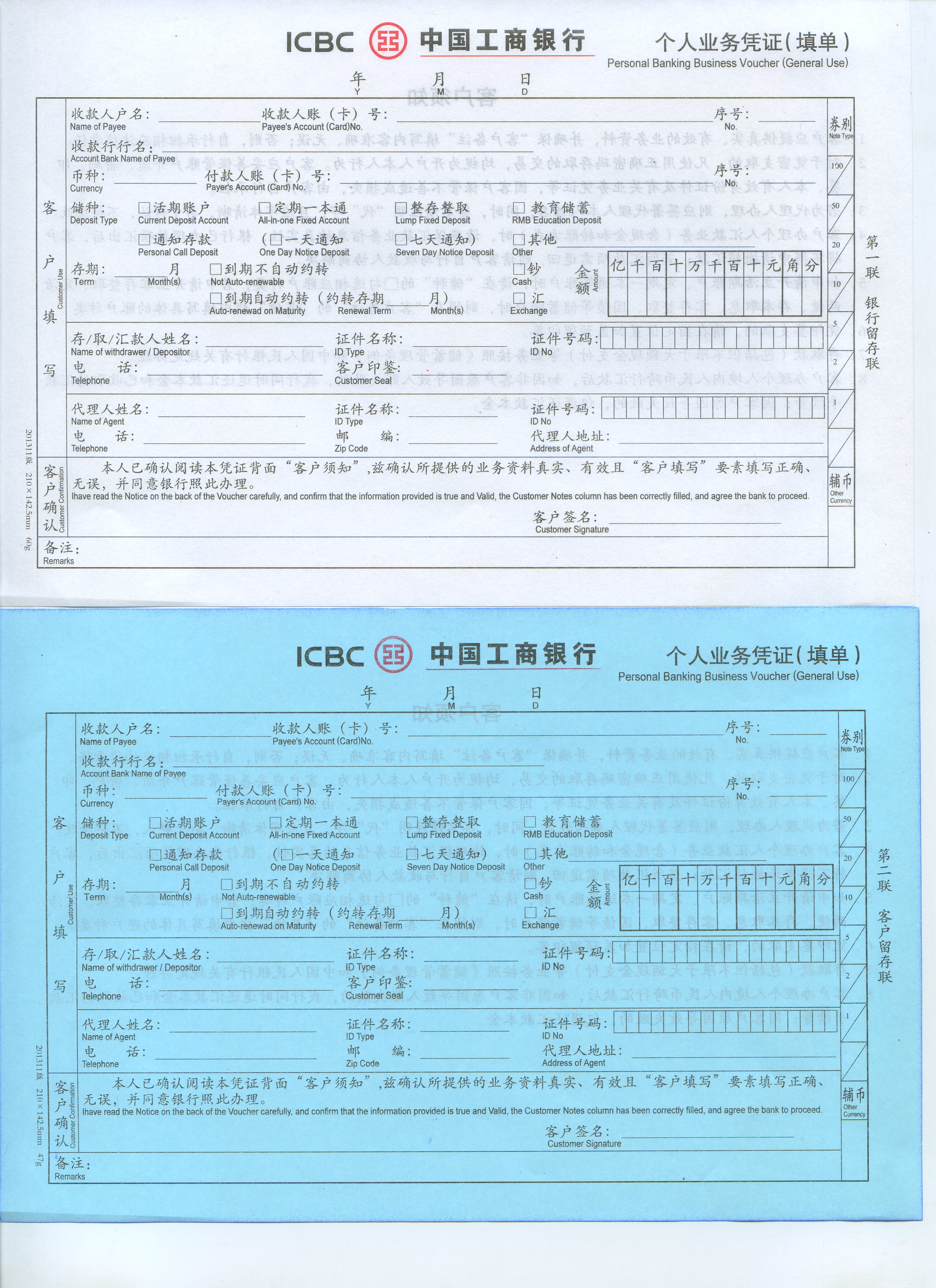 3、《中国工商银行个人业务凭证》(填单)式样